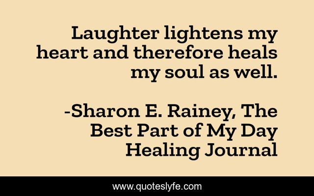 This page presents the quote "Laughter lightens my heart and therefore heals my soul as well.". Author of this quote is Sharon E. Rainey, The Best Part of My Day Healing Journal. This quote is about heart, lighten, laughter, healing, soul,.