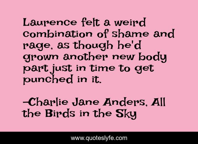 This page presents the quote "Laurence felt a weird combination of shame and rage, as though he'd grown another new body part just in time to get punched in it.". Author of this quote is Charlie Jane Anders, All the Birds in the Sky. This quote is about shame, rage,.