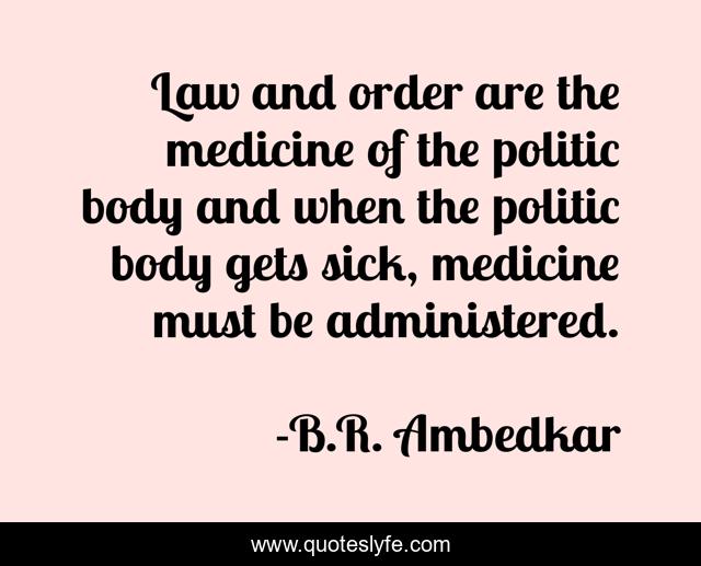 This page presents the quote "Law and order are the medicine of the politic body and when the politic body gets sick, medicine must be administered.". Author of this quote is B.R. Ambedkar. This quote is about politics, law, order,.