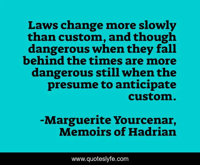 "Marguerite Yourcenar, Memoirs of Hadrian Quotes." Quoteslyfe.com, 2025. Fri. 05 Dec. 2025. <https://www.quoteslyfe.com/quote/Laws-change-more-slowly-than-custom-and-199683>.
