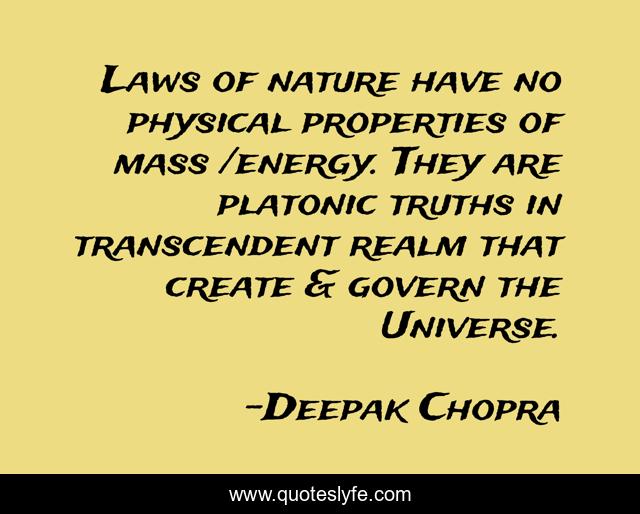 This page presents the quote "Laws of nature have no physical properties of mass /energy. They are platonic truths in transcendent realm that create & govern the Universe.". Author of this quote is Deepak Chopra. This quote is about energy, creation, quotes, physical, realm, create, creativity, transcendent, universal,.