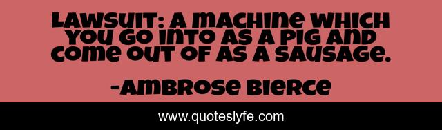 This page presents the quote "Lawsuit: A machine which you go into as a pig and come out of as a sausage.". Author of this quote is Ambrose Bierce. This quote is about machine, pig,.