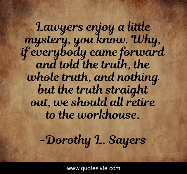 This page presents the quote "Lawyers enjoy a little mystery, you know. Why, if everybody came forward and told the truth, the whole truth, and nothing but the truth straight out, we should all retire to the workhouse.". Author of this quote is Dorothy L. Sayers. This quote is about enjoy, mystery,.