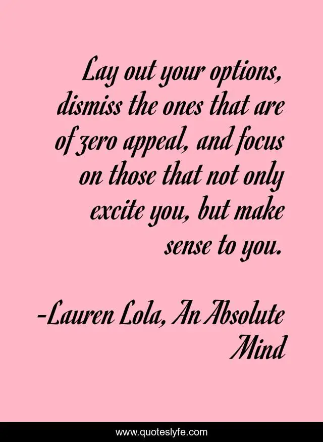 "Lauren Lola, An Absolute Mind Quotes." Quoteslyfe.com, 2025. Sat. 06 Dec. 2025. <https://www.quoteslyfe.com/quote/Lay-out-your-options-dismiss-the-ones-141027>.