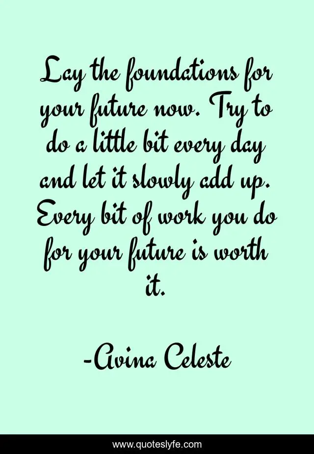 This page presents the quote "Lay the foundations for your future now. Try to do a little bit every day and let it slowly add up. Every bit of work you do for your future is worth it.". Author of this quote is Avina Celeste. This quote is about foundation, confidence, positive, motivational, future, optimistic, inspirational, enthusiasm,.