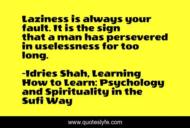This page presents the quote "Laziness is always your fault. It is the sign that a man has persevered in uselessness for too long.". Author of this quote is Idries Shah, Learning How to Learn: Psychology and Spirituality in the Sufi Way. This quote is about psychology, self, laziness, sufism, ego, sufis,.
