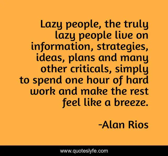 This page presents the quote "Lazy people, the truly lazy people live on information, strategies, ideas, plans and many other criticals, simply to spend one hour of hard work and make the rest feel like a breeze.". Author of this quote is Alan Rios. This quote is about sloth, lazy, humor, slack, lazy-people, laziness, procrastinate, laugh, slothfulness,.