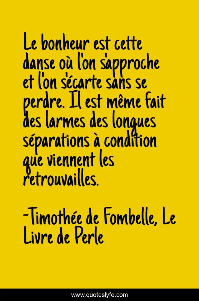 This page presents the quote "Le bonheur est cette danse où l'on s'approche et l'on s'écarte sans se perdre. Il est même fait des larmes des longues séparations à condition que viennent les retrouvailles.". Author of this quote is Timothée de Fombelle, Le Livre de Perle. This quote is about life, love, happiness, affection,.