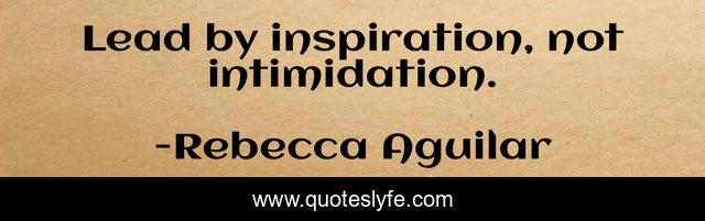 This page presents the quote "Lead by inspiration, not intimidation.". Author of this quote is Rebecca Aguilar. This quote is about intimidate, leadership, inspire, inspiration,.