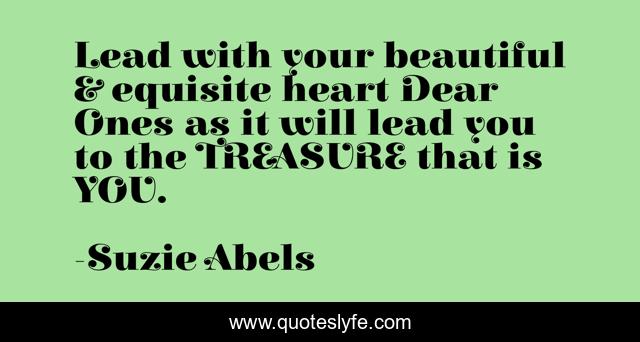 This page presents the quote "Lead with your beautiful & equisite heart Dear Ones as it will lead you to the TREASURE that is YOU.". Author of this quote is Suzie Abels. This quote is about abundance, serving-others, love, compassion, joy, selflove, an-attitude-of-gratitude, kindness, affection,.