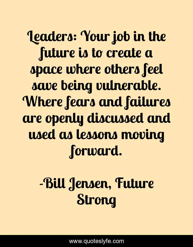 This page presents the quote "Leaders: Your job in the future is to create a space where others feel save being vulnerable. Where fears and failures are openly discussed and used as lessons moving forward.". Author of this quote is Bill Jensen, Future Strong. This quote is about enthusiasm, future, leadership, inspirational, self-help,.