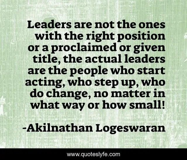 This page presents the quote "Leaders are not the ones with the right position or a proclaimed or given title, the actual leaders are the people who start acting, who step up, who do change, no matter in what way or how small!". Author of this quote is Akilnathan Logeswaran. This quote is about impact, real-leaders, leaders, title, real-leadership, leaders-without-titles, leadership, change, step-up,.