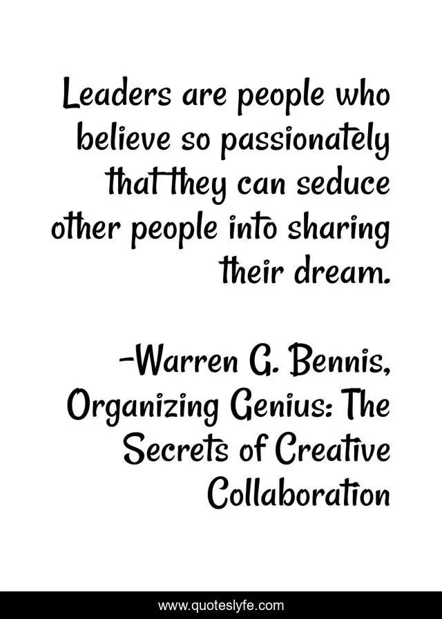 "Warren G. Bennis, Organizing Genius: The Secrets of Creative Collaboration Quotes." Quoteslyfe.com, 2025. Sun. 07 Dec. 2025. <https://www.quoteslyfe.com/quote/Leaders-are-people-who-believe-so-passionately-64021>.
