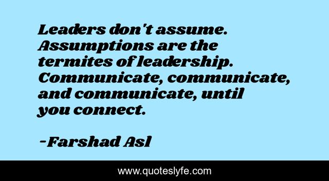 This page presents the quote "Leaders don't assume. Assumptions are the termites of leadership. Communicate, communicate, and communicate, until you connect.". Author of this quote is Farshad Asl. This quote is about communication, assumptions, leadership,.
