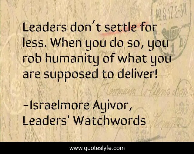 This page presents the quote "Leaders don’t settle for less. When you do so, you rob humanity of what you are supposed to deliver!". Author of this quote is Israelmore Ayivor, Leaders' Watchwords. This quote is about food-for-thought, leaders, don-t-settle-for-less, settle-for-less, israelmore-ayivor, humanity, talents, settle, purpose,.