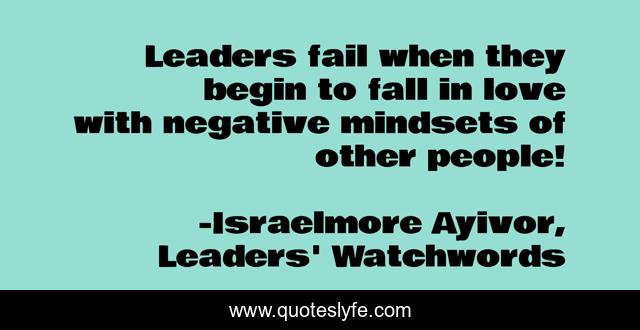 This page presents the quote "Leaders fail when they begin to fall in love with negative mindsets of other people!". Author of this quote is Israelmore Ayivor, Leaders' Watchwords. This quote is about food-for-thought, leaders, failure, negative-people, ideas, mental-attitude, leadership, lead-people, israelmore-ayivor,.
