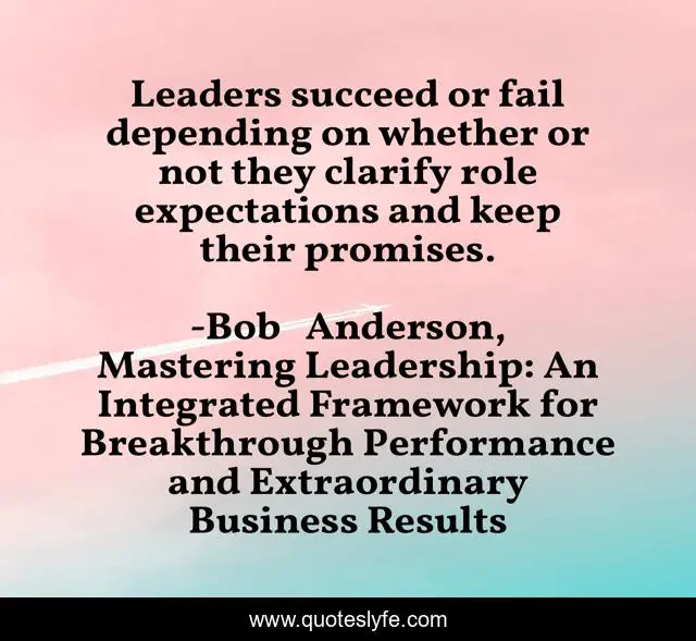 This page presents the quote "Leaders succeed or fail depending on whether or not they clarify role expectations and keep their promises.". Author of this quote is Bob Anderson, Mastering Leadership: An Integrated Framework for Breakthrough Performance and Extraordinary Business Results. This quote is about promises, leaders, success, expectations, failure, leadership, role,.