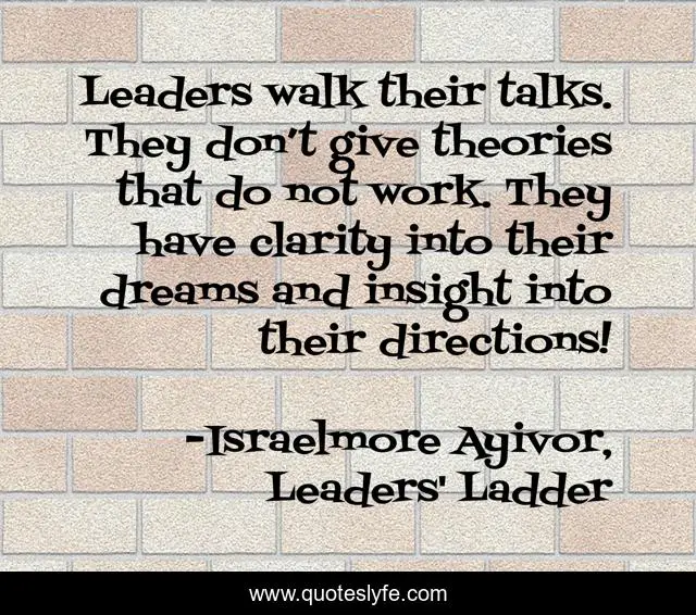 "Israelmore Ayivor, Leaders' Ladder Quotes." Quoteslyfe.com, 2025. Mon. 08 Dec. 2025. <https://www.quoteslyfe.com/quote/Leaders-walk-their-talks-They-don-t-65090>.