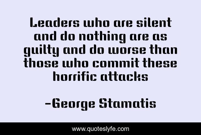 This page presents the quote "Leaders who are silent and do nothing are as guilty and do worse than those who commit these horrific attacks". Author of this quote is George Stamatis. This quote is about horrific-attack, government, crimes, attack, prime-minister, crimes-against-humanity, president, leader,.