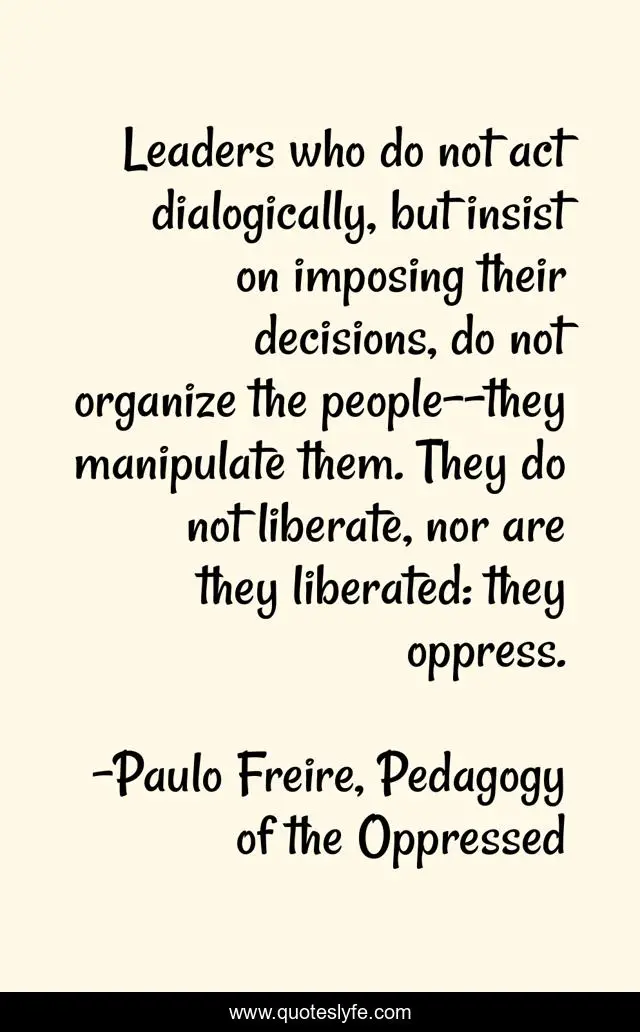 This page presents the quote "Leaders who do not act dialogically, but insist on imposing their decisions, do not organize the people--they manipulate them. They do not liberate, nor are they liberated: they oppress.". Author of this quote is Paulo Freire, Pedagogy of the Oppressed. This quote is about liberation, oppression,.