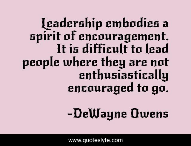 This page presents the quote "Leadership embodies a spirit of encouragement. It is difficult to lead people where they are not enthusiastically encouraged to go.". Author of this quote is DeWayne Owens. This quote is about life, inspirational, success, leadership-development, leadership-charteristics, motivational-inspirational, motivational, confidence, wisdom,.
