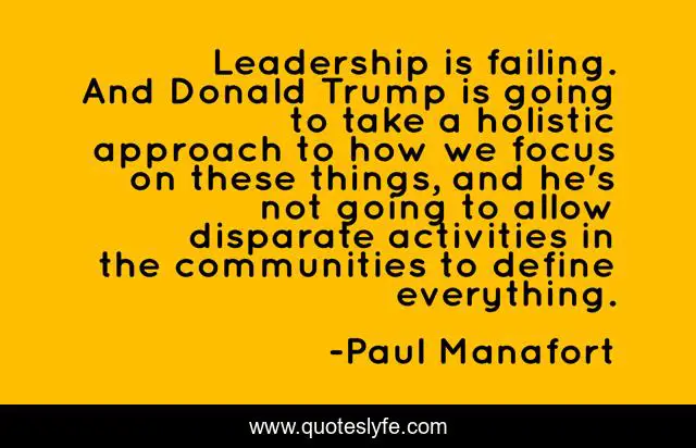 This page presents the quote "Leadership is failing. And Donald Trump is going to take a holistic approach to how we focus on these things, and he's not going to allow disparate activities in the communities to define everything.". Author of this quote is Paul Manafort. This quote is about going, approach, focus,.