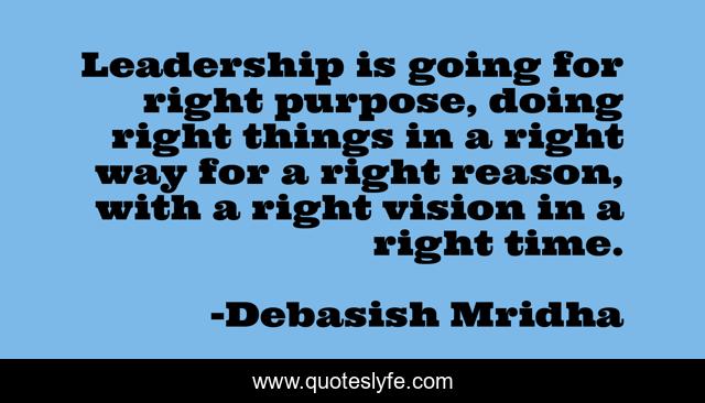 This page presents the quote "Leadership is going for right purpose, doing right things in a right way for a right reason, with a right vision in a right time.". Author of this quote is Debasish Mridha. This quote is about life, love, knowledge, inspirational, intelligence, philosophy, wisdom, quotes, affection,.