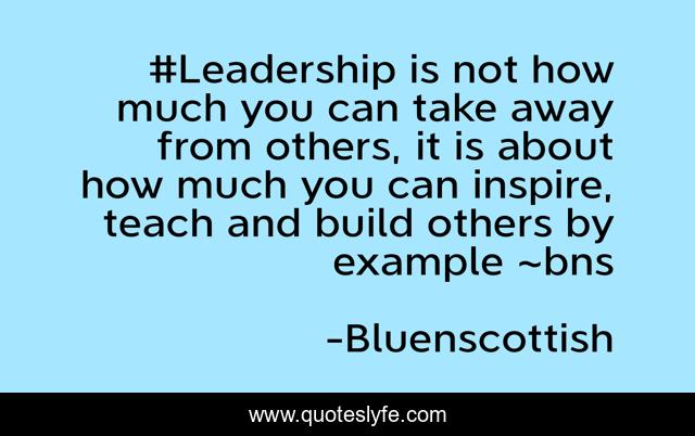 This page presents the quote "#Leadership is not how much you can take away from others, it is about how much you can inspire, teach and build others by example ~bns". Author of this quote is Bluenscottish. This quote is about coaching, leadership, success, leadership-development,.