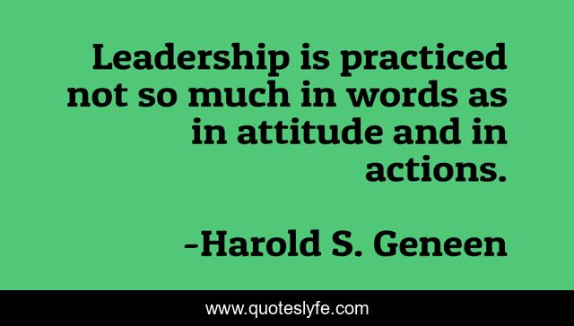 This page presents the quote "Leadership is practiced not so much in words as in attitude and in actions.". Author of this quote is Harold S. Geneen. This quote is about leadership, words, actions,.