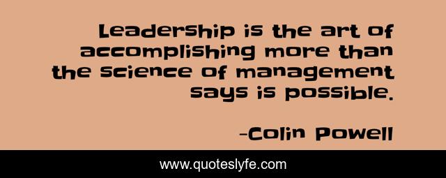 This page presents the quote "Leadership is the art of accomplishing more than the science of management says is possible.". Author of this quote is Colin Powell. This quote is about accomplishment, leadership, management, management-and-leadership,.