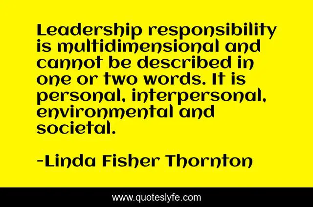 This page presents the quote "Leadership responsibility is multidimensional and cannot be described in one or two words. It is personal, interpersonal, environmental and societal.". Author of this quote is Linda Fisher Thornton. This quote is about ethical-leadership, ethics, leadership, ethics-and-moral-philosophy,.
