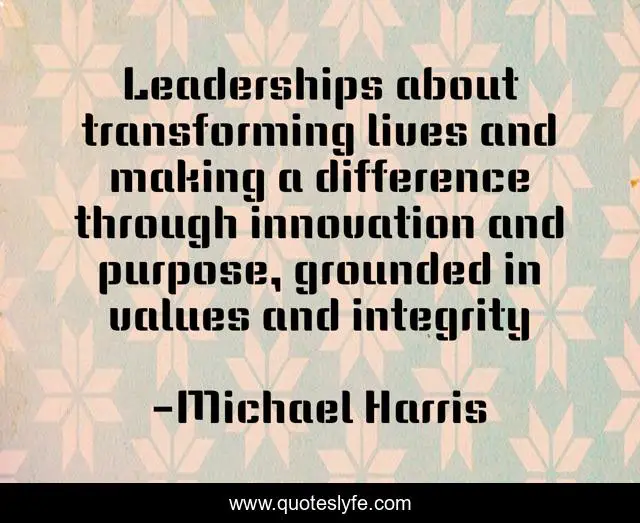 This page presents the quote "Leaderships about transforming lives and making a difference through innovation and purpose, grounded in values and integrity". Author of this quote is Michael Harris. This quote is about leaders, grounded, leadership-traits, leadership, values, lives, integrity, transformation, making-a-differencepurpose,.