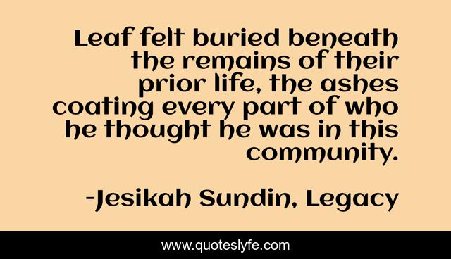 This page presents the quote "Leaf felt buried beneath the remains of their prior life, the ashes coating every part of who he thought he was in this community.". Author of this quote is Jesikah Sundin, Legacy. This quote is about biodome, leaf, willow, colonization, legacy, chronicles, mars, fillion,.