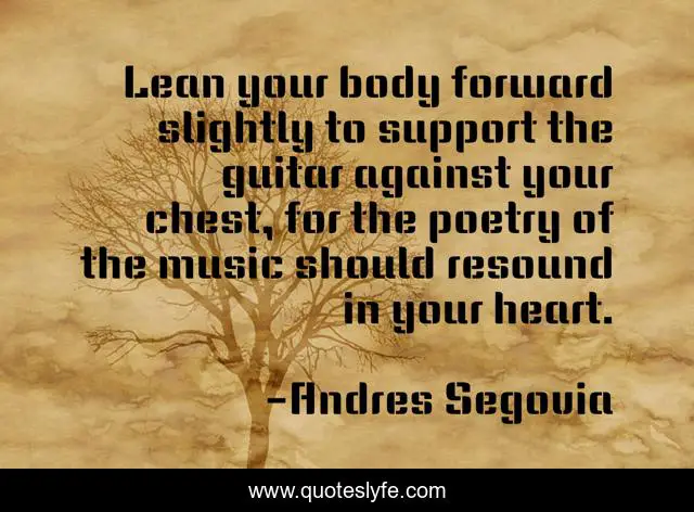 This page presents the quote "Lean your body forward slightly to support the guitar against your chest, for the poetry of the music should resound in your heart.". Author of this quote is Andres Segovia. This quote is about heart, support, poetry,.
