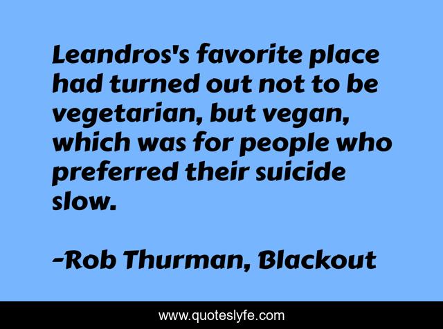 This page presents the quote "Leandros's favorite place had turned out not to be vegetarian, but vegan, which was for people who preferred their suicide slow.". Author of this quote is Rob Thurman, Blackout. .