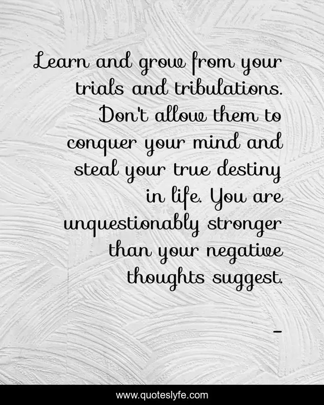 Learn and grow from your trials and tribulations. Don't allow them to conquer your mind and steal your true destiny in life. You are unquestionably stronger than your negative thoughts suggest.