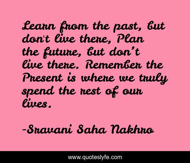 This page presents the quote "Learn from the past, but don't live there, Plan the future, but don’t live there. Remember the Present is where we truly spend the rest of our lives.". Author of this quote is Sravani Saha Nakhro. .