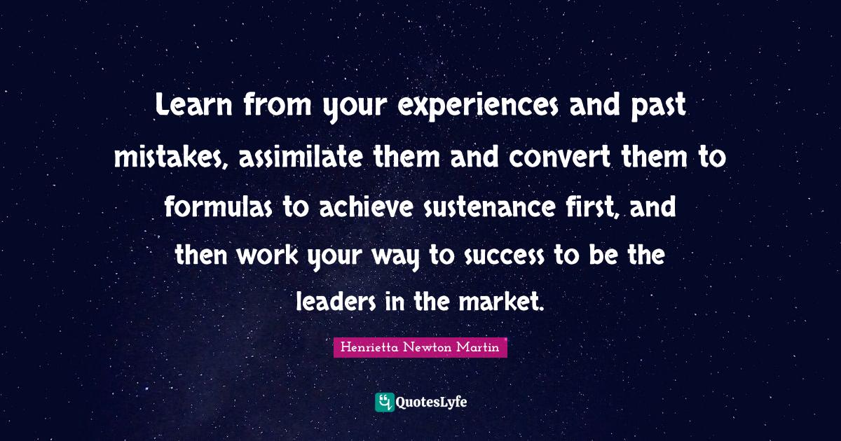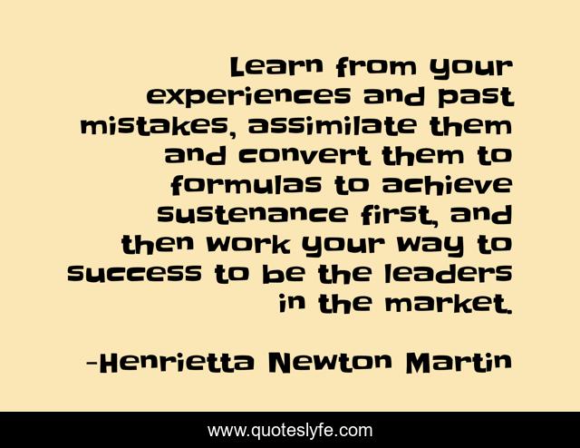 This page presents the quote "Learn from your experiences and past mistakes, assimilate them and convert them to formulas to achieve sustenance first, and then work your way to success to be the leaders in the market.". Author of this quote is Henrietta Newton Martin. This quote is about leaders-in-the-market, leadership-development, leadership-and-management, leadership-characteristics, leader, market,.
