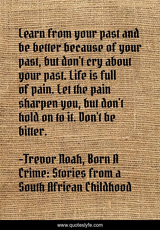This page presents the quote "Learn from your past and be better because of your past, but don't cry about your past. Life is full of pain. Let the pain sharpen you, but don't hold on to it. Don't be bitter.". Author of this quote is Trevor Noah, Born A Crime: Stories from a South African Childhood. This quote is about inspirational-life, memoir, past-and-present, life-lessons,.