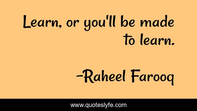 This page presents the quote "Learn, or you'll be made to learn.". Author of this quote is Raheel Farooq. This quote is about life, learning, wisdom,.