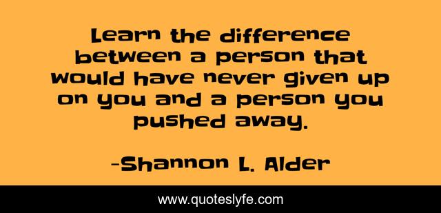 This page presents the quote "Learn the difference between a person that would have never given up on you and a person you pushed away.". Author of this quote is Shannon L. Alder. This quote is about difference, actions, never-give-up,.