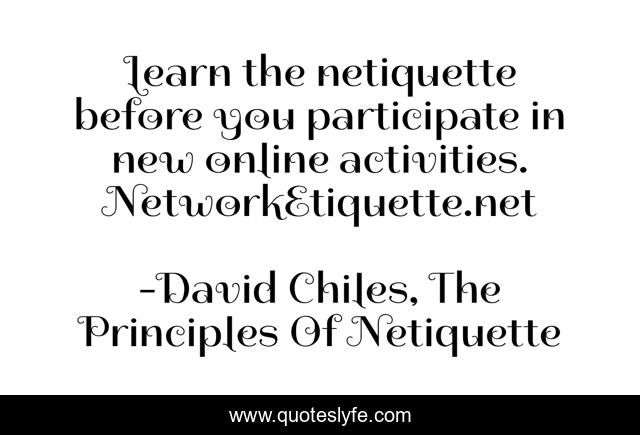 "David Chiles, The Principles Of Netiquette Quotes." Quoteslyfe.com, 2025. Fri. 05 Dec. 2025. <https://www.quoteslyfe.com/quote/Learn-the-netiquette-before-you-participate-in-243521>.