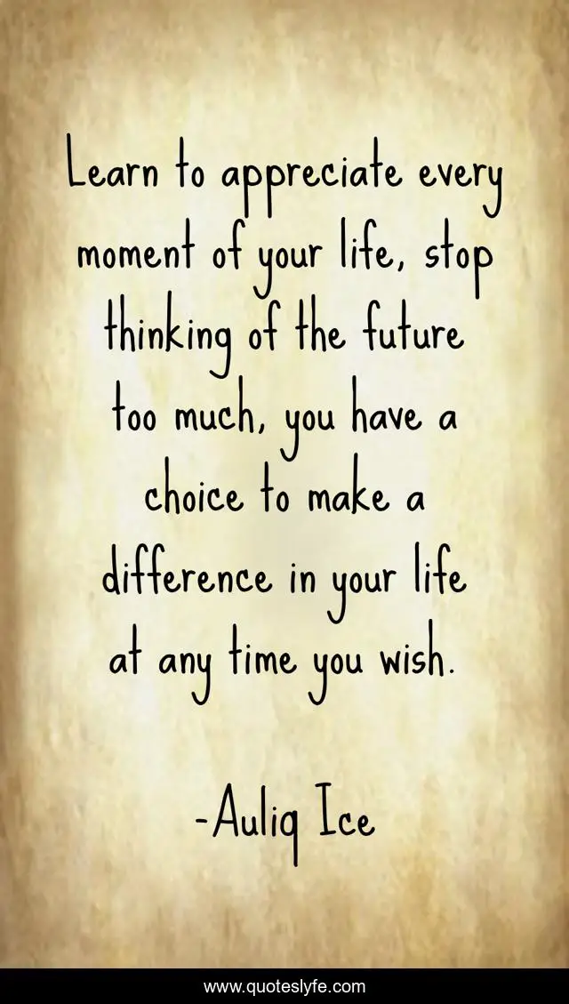 This page presents the quote "Learn to appreciate every moment of your life, stop thinking of the future too much, you have a choice to make a difference in your life at any time you wish.". Author of this quote is Auliq Ice. This quote is about life, life-lessons, making-a-difference, positive, motivational, confidence, choices, making-a-difference-in-the-world, optimistic,.