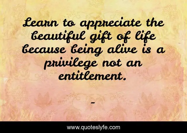 This page presents the quote "Learn to appreciate the beautiful gift of life because being alive is a privilege not an entitlement.". Author of this quote is . This quote is about the-beauty-of-life, being-alive, edmond-mbiaka, appreciate, the-gift-of-life, entitlment, learn-to-appreciate, privilege, appreciating,.