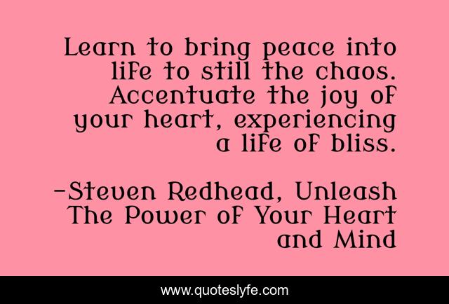 This page presents the quote "Learn to bring peace into life to still the chaos. Accentuate the joy of your heart, experiencing a life of bliss.". Author of this quote is Steven Redhead, Unleash The Power of Your Heart and Mind. This quote is about heart, life, joy, peace, chaos, bliss, life-of-bliss,.