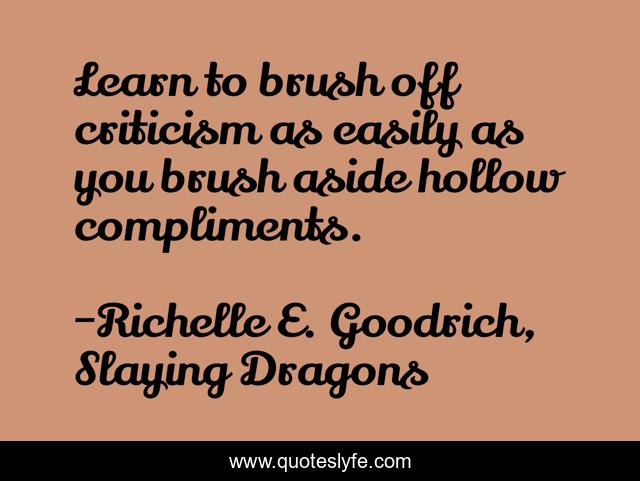 This page presents the quote "Learn to brush off criticism as easily as you brush aside hollow compliments.". Author of this quote is Richelle E. Goodrich, Slaying Dragons. This quote is about criticism, brush-off, ignore-critics, richelle-e-goodrich, critical, richelle, richelle-goodrich,.