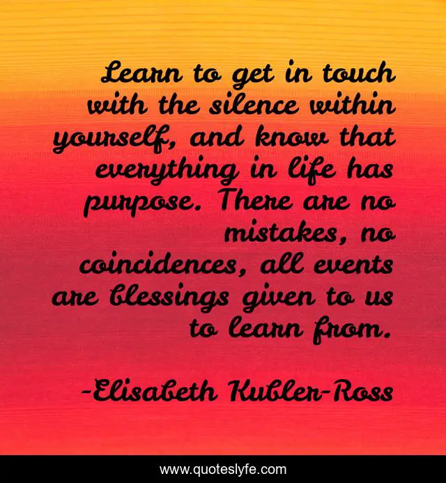 This page presents the quote "Learn to get in touch with the silence within yourself, and know that everything in life has purpose. There are no mistakes, no coincidences, all events are blessings given to us to learn from.". Author of this quote is Elisabeth Kubler-Ross. This quote is about life, mistakes, silence,.