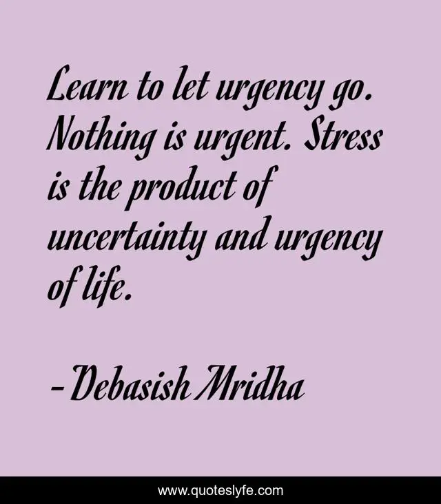 This page presents the quote "Learn to let urgency go. Nothing is urgent. Stress is the product of uncertainty and urgency of life.". Author of this quote is Debasish Mridha. This quote is about life, love, knowledge, inspirational, intelligence, philosophy, wisdom, quotes, affection,.