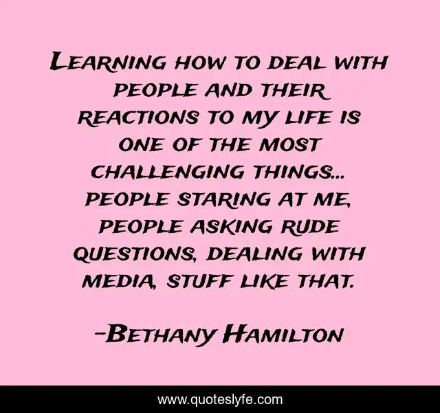 This page presents the quote "Learning how to deal with people and their reactions to my life is one of the most challenging things... people staring at me, people asking rude questions, dealing with media, stuff like that.". Author of this quote is Bethany Hamilton. This quote is about me, media, life,.