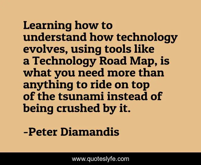 This page presents the quote "Learning how to understand how technology evolves, using tools like a Technology Road Map, is what you need more than anything to ride on top of the tsunami instead of being crushed by it.". Author of this quote is Peter Diamandis. This quote is about technology, tools, road,.